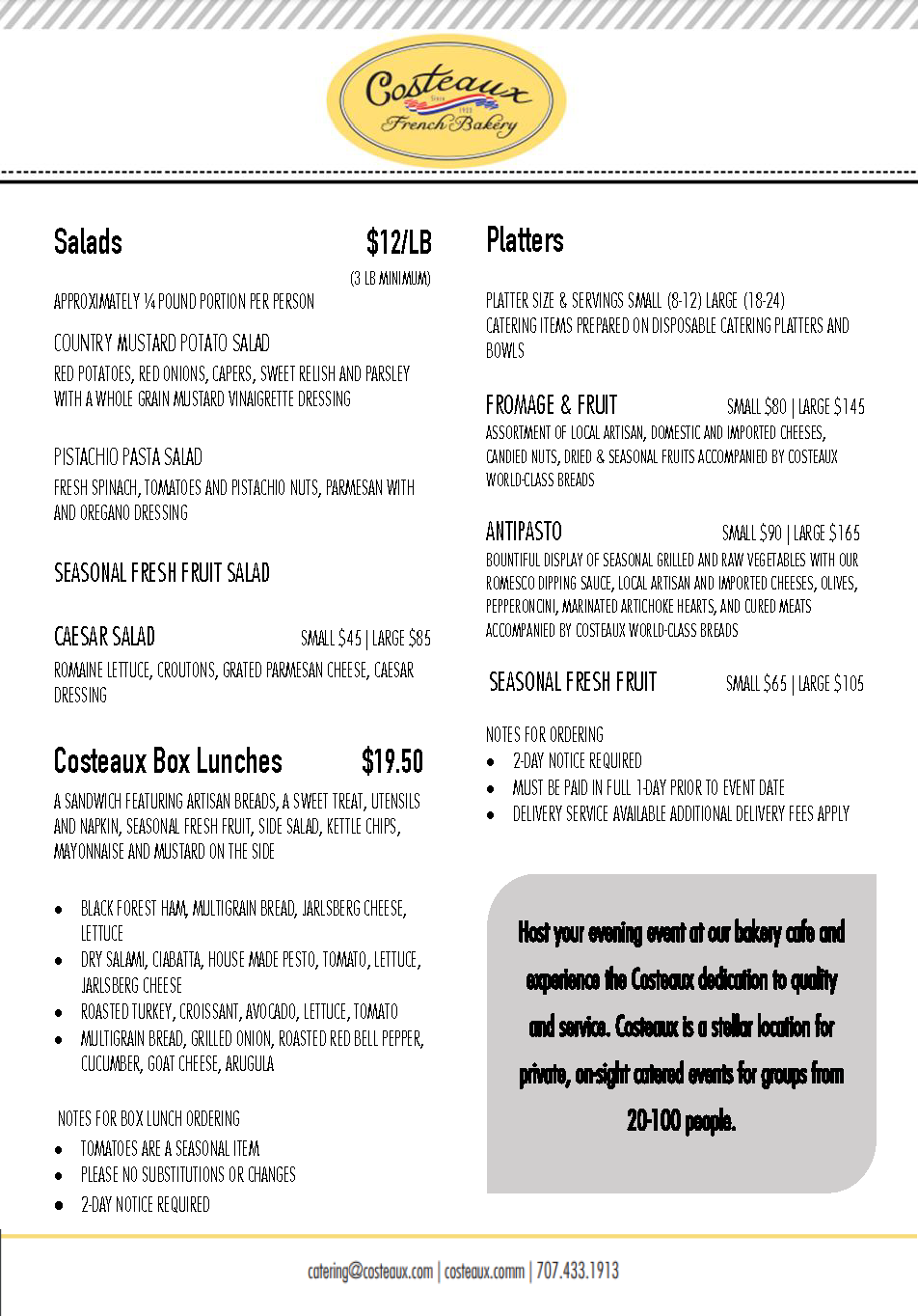 Both pick up and off-site catering delivery is available. There is a nominal charge for delivery depending upon your proximity to our Healdsburg bakery café. Full on-site catering available!