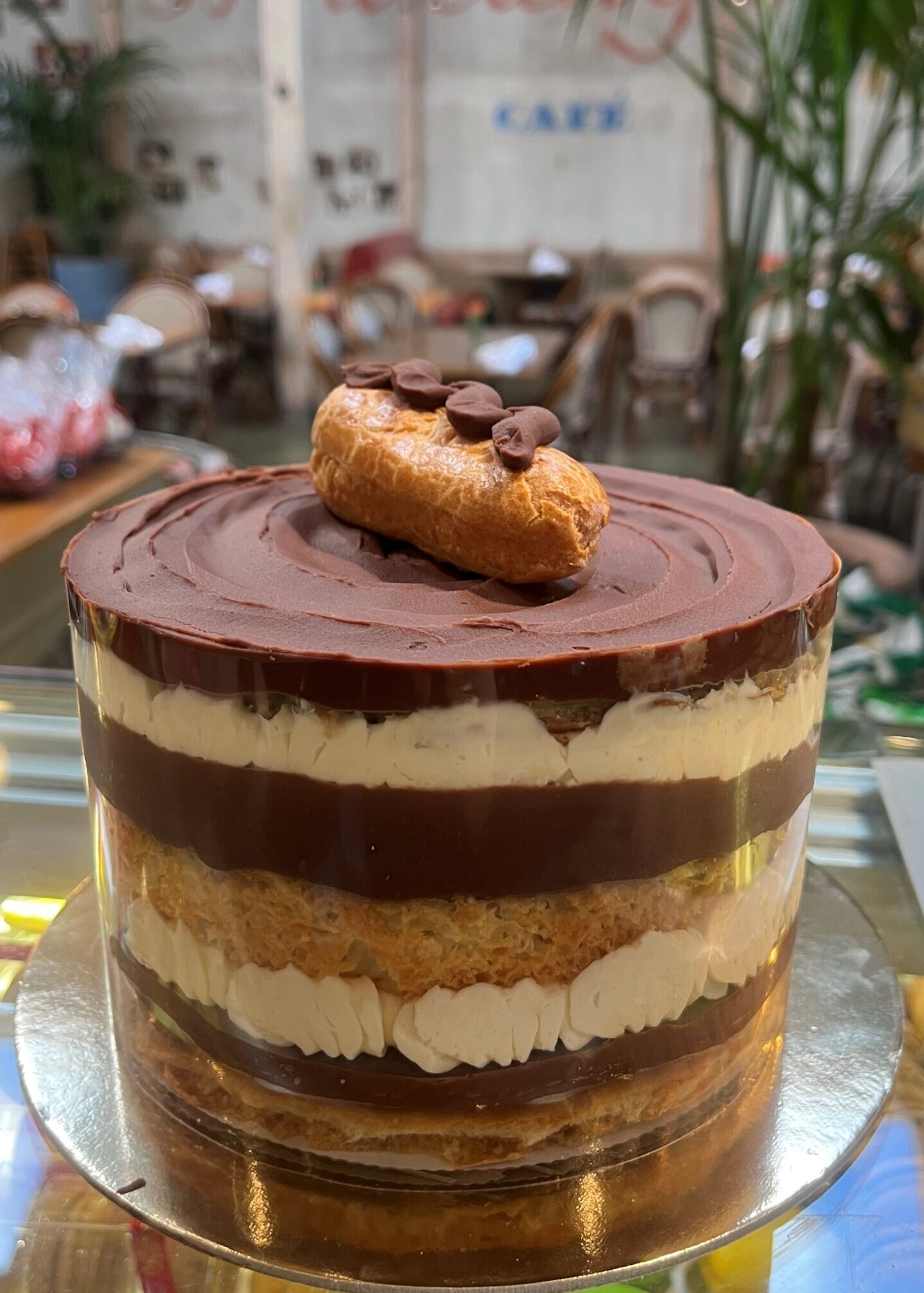 Two layers of pâte à choux and white chiffon cake, lightly soaked with rum, filled with Bavarian custard and creamy chocolate truffle.