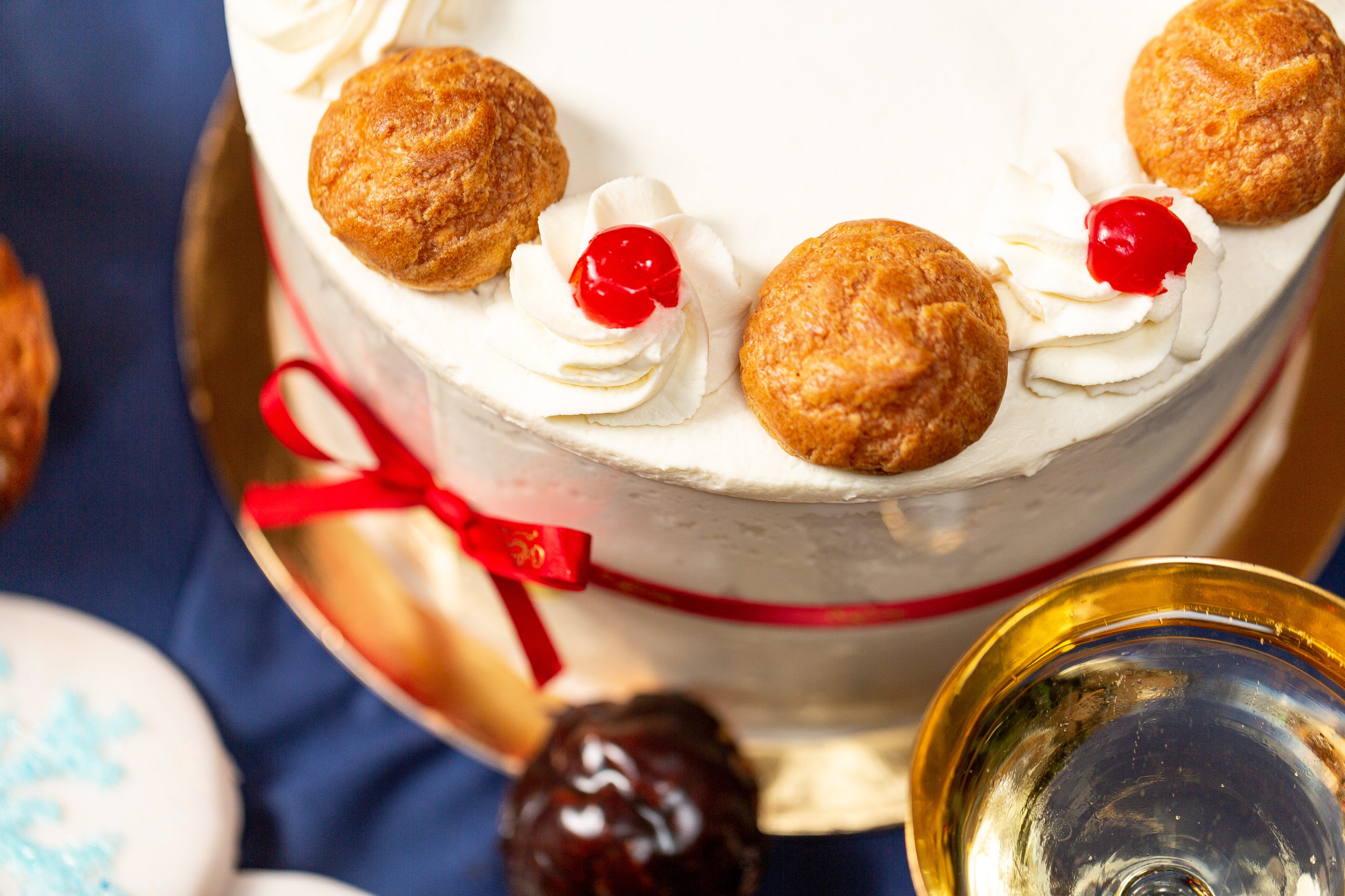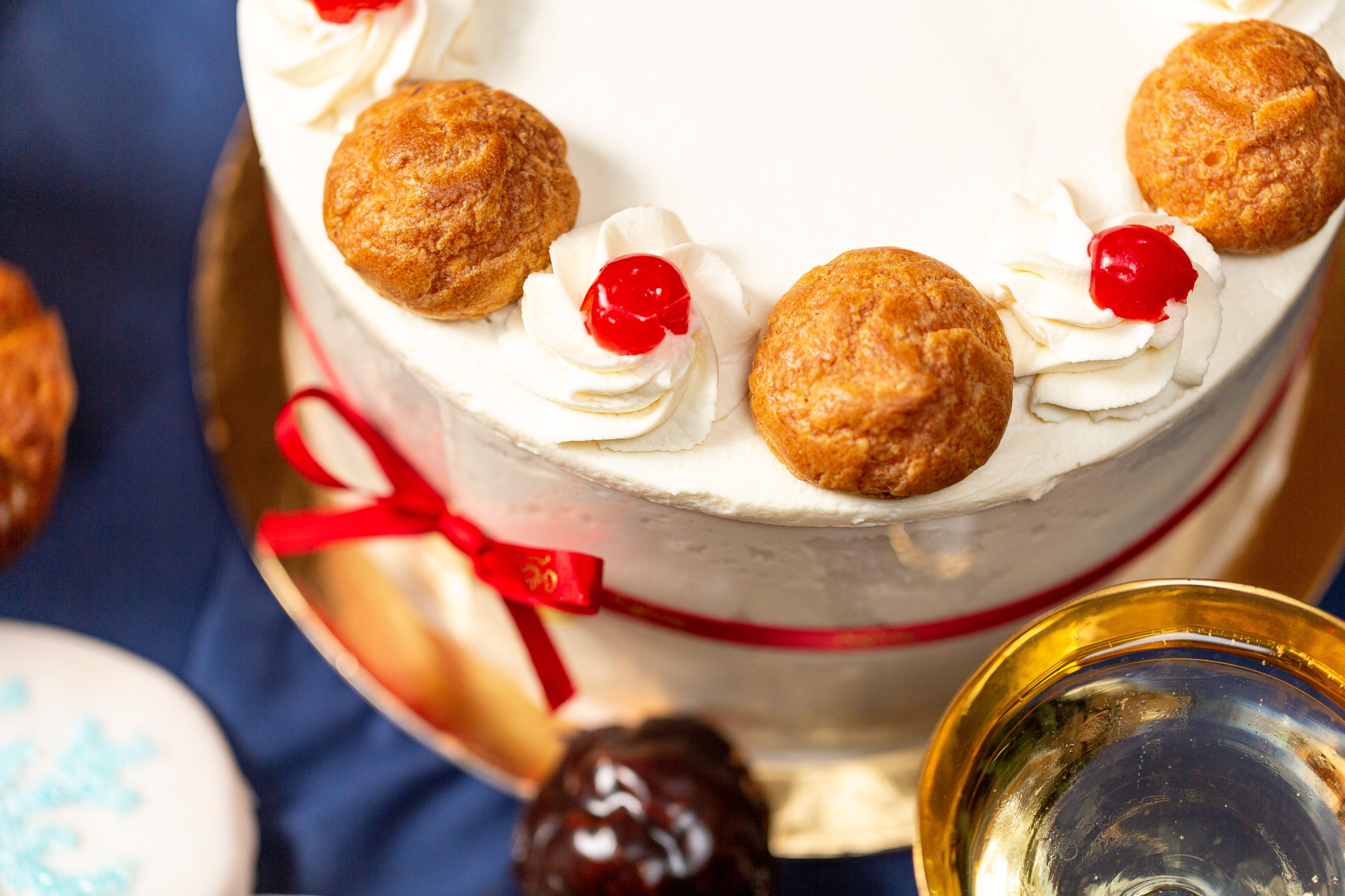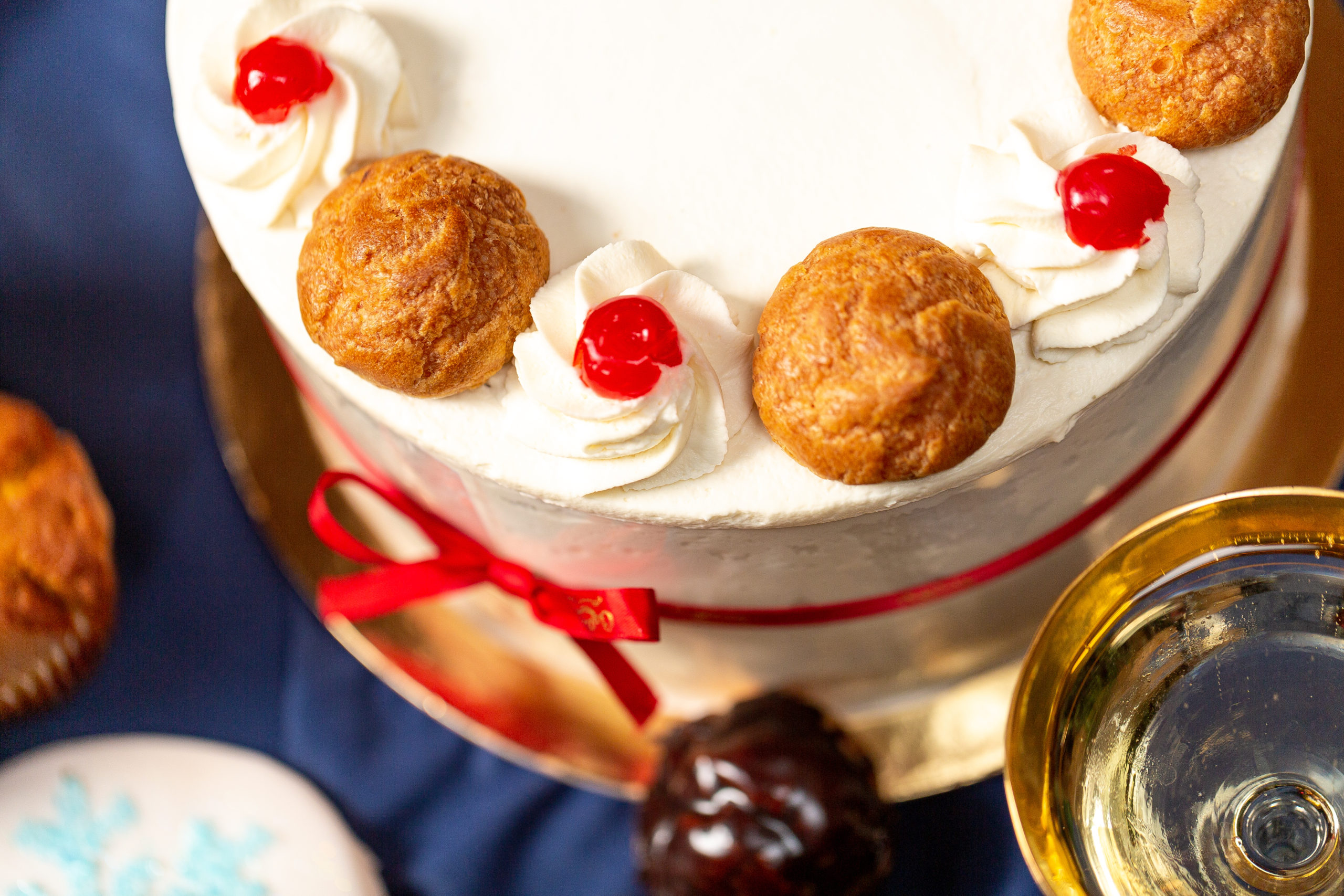 White chiffon brushed with rum, filled with rum custard and whipped cream atop a layer of puff pastry coated with chocolate butter cream & frosted with whipped cream, topped with rum custard bon bons. A Seppi family favorite!