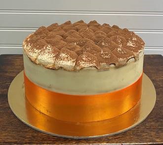 White chiffon cake soaked in espresso coffee and rum, filled with mascarpone and cream cheese frosting, topped with cocoa powder.